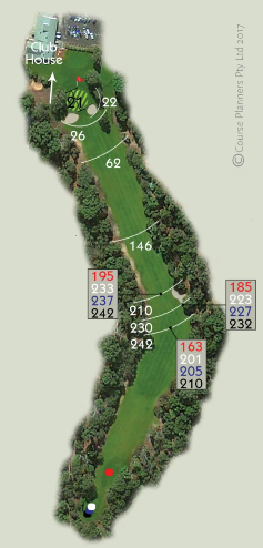 A tough finishing hole that doglegs to the left at 210 metres. There is a bunker on the outside of the corner at 230 metres from the tee, land in it and you will doing well to make par. The green is uphill and protected by two deep bunkers. A tough finish to your round.